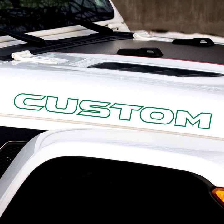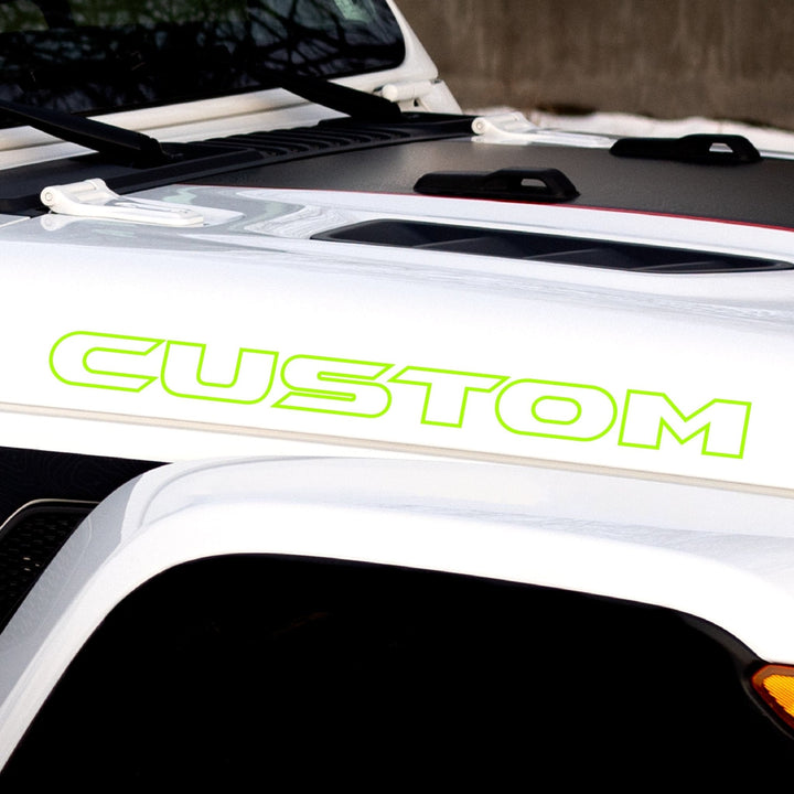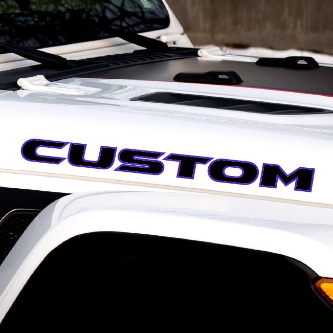 Includes: (2) Custom Text Decals, one for each side of the hood